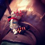 There wasn’t a whole lot to the legs, actually. The kneepads were cardboard wrapped in leather, and the knee gaskets were more foam board. The round skid plate on the knee was a leftover bit of the face dome, where I’d cut out holes for the port-holes. I mounted webbing at three points on the knee gasket, and also at three points in each leg hole on the main body. The main body’s webbing attached to the gaskets’ via more adjustable buckles. The leg’s burlap was then velcro’d to the inside of the leg holes. The goal here was to avoid having the leg material supporting the knee gaskets. It worked okay. The bottom of the leg material had a bit more velcro that would stick to the inside of the boots.
