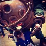 Ah, the boots. I had hoped I could stand with my feet on the ground rather than using platforms, but after trying on the main shell, I realized my legs would be way too stubby. My first attempt at platforms involved a wooden contraption with hinges. It flexed just like a real foot, I had excellent balance even on my tiptoes, and it was heavy and fragile. They broke during a trial run. The backup plan was to glue together multiple layers of foam board to provide a platform. To make walking easier, I cut a taper off the front half so the foot could kind of roll forward. I screwed/glued a pair of sandals onto the foam platform, then used a piece of sewer drain as a vertical ankle sort of thing. This was glued directly to the foam platform, around my own ankle. I attached rigid fiberglass strips over my own toes to make that rounded front of the shoe. I covered the front of the shoe with some quilt batting to smooth out the imperfections, then stretchy fabric and resin to give a hard steel-toe kind of feel. Glued some leathery fabric around the back portion of the shoe and up & over the “ankle” pipe, then added some grommets to that leather fabric to provide shoelace holes. Covered the seams with some foam tape, added some upholstery nails, and attached the dive weights, and they actually turned out pretty okay. The best part? I was still wearing sandals, even while in costume.
