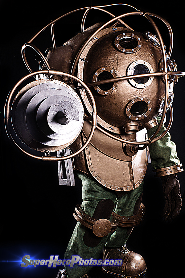 One of the more subtle pieces on this costume is the dive weights. Those I made by gluing together a couple sheets of foam board, cutting out the general shape with a jig saw, and sanding the edges round. A bit of epoxy resin and paint, and they were ready to hang. To hang ’em on the body/boots, I used a cheap-o belt from Good Will, added a snap to each anchor point, and screwed or pop-riveted the belt to the body/boots. They turned out okay.
