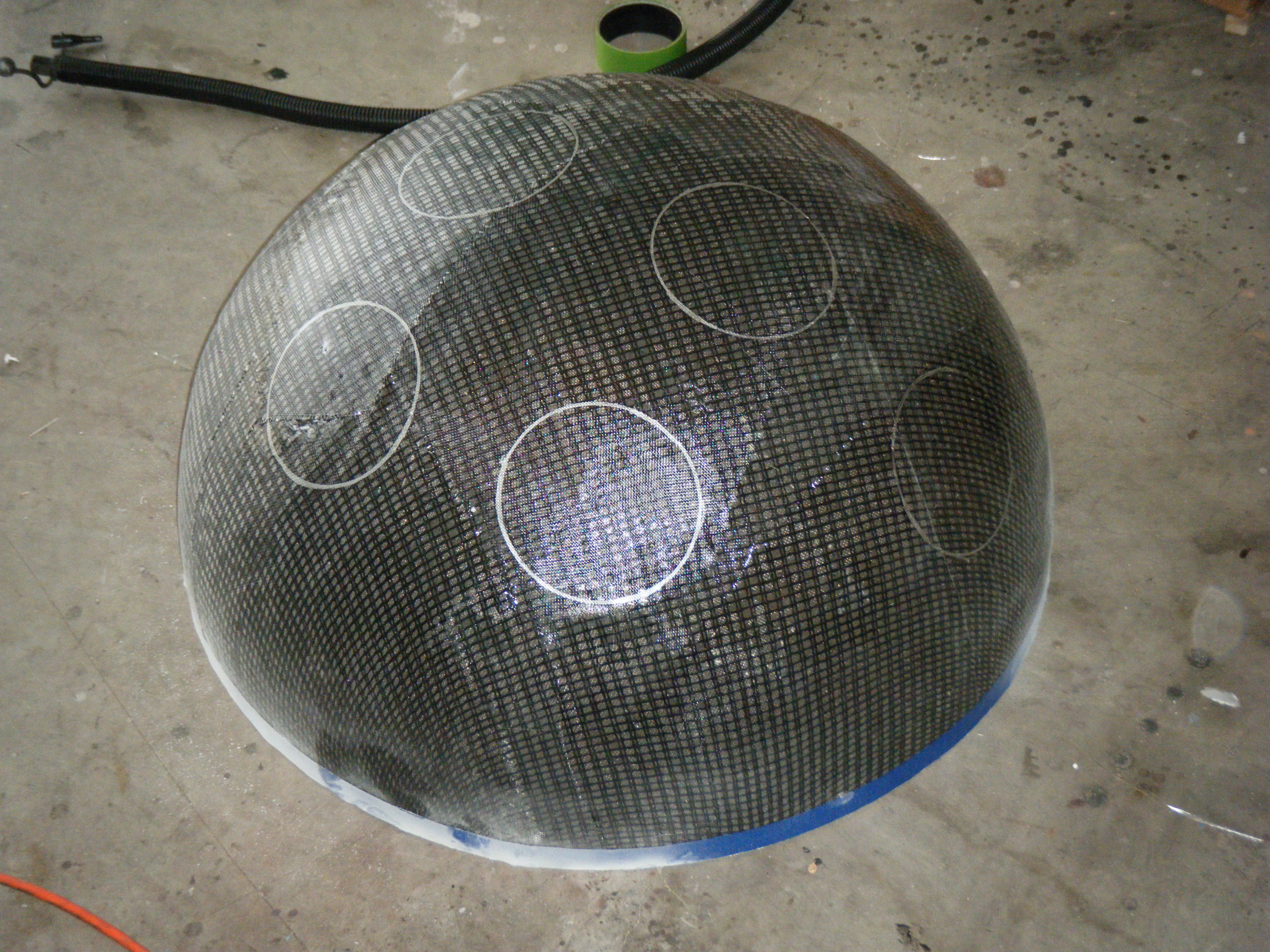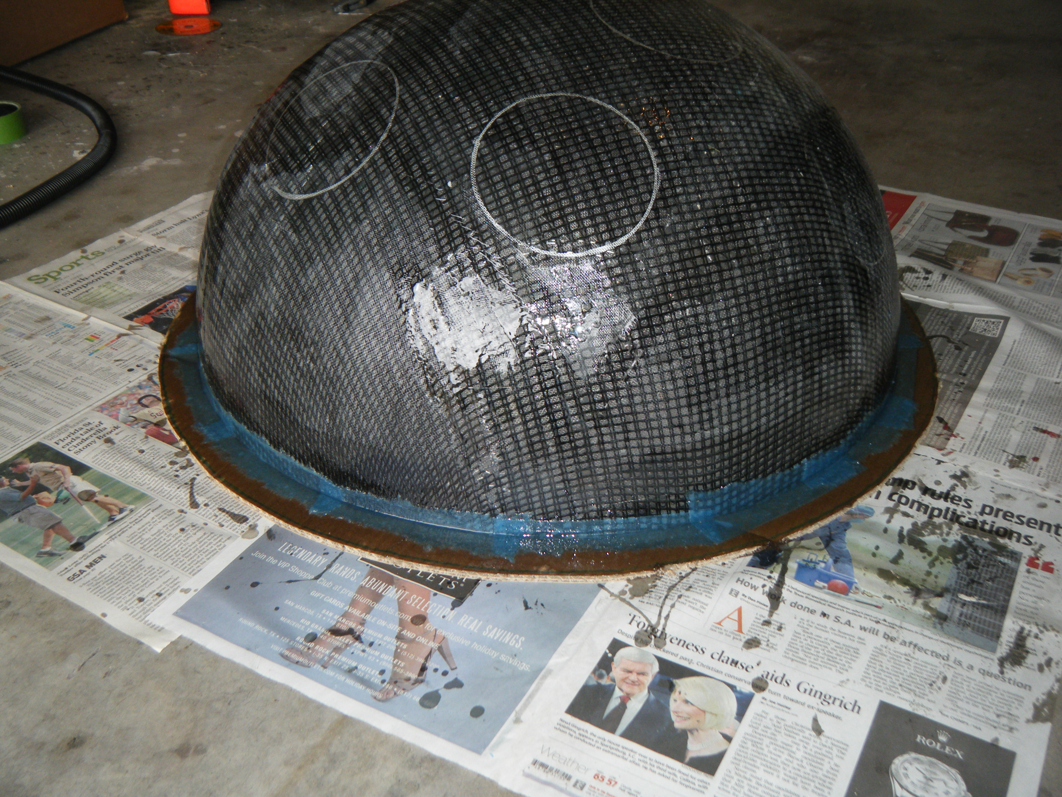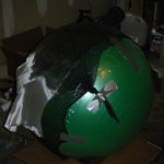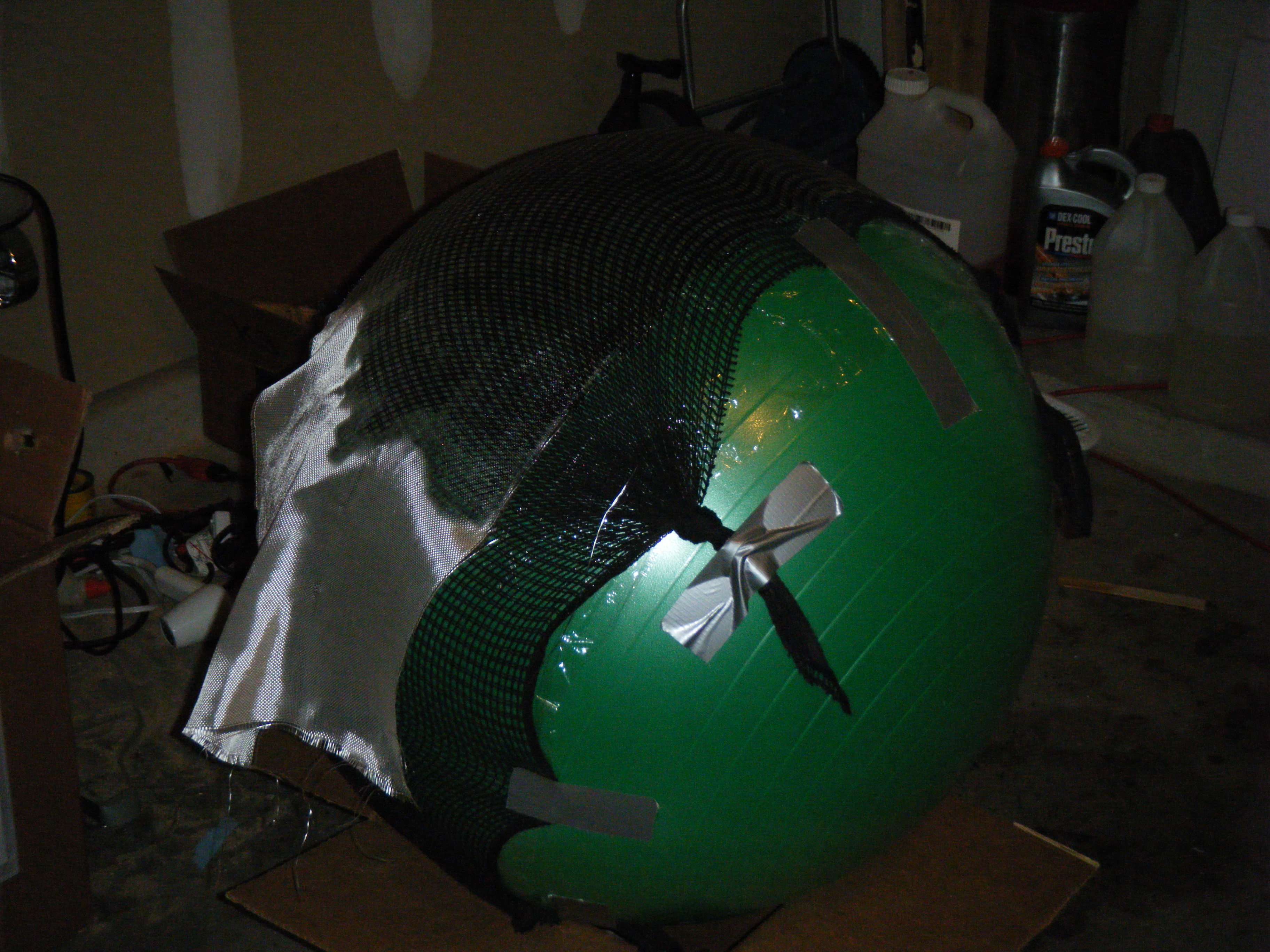 Since my sketch dictated a ~25″ diameter face dome, I bought a 26″ exercise ball, wrapped it in plastic-wrap to protect it (because I’m reselling it at work after I’m done using it as a mold), and did a layer of fiberglass and resin over top. I wasn’t sure if the solvents in polyester resin would eat through the plastic-wrap or not, so I played it safe and used epoxy marine resin. Once it cured, I deflated the exercise ball, trimmed the fiberglass piece down to a perfect hemisphere, and attached a lip of cardboard with some resin-soaked shop towels.