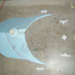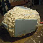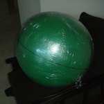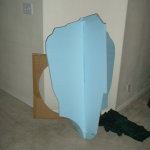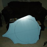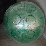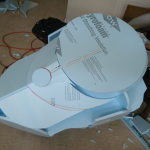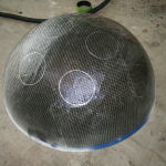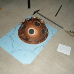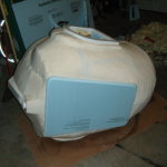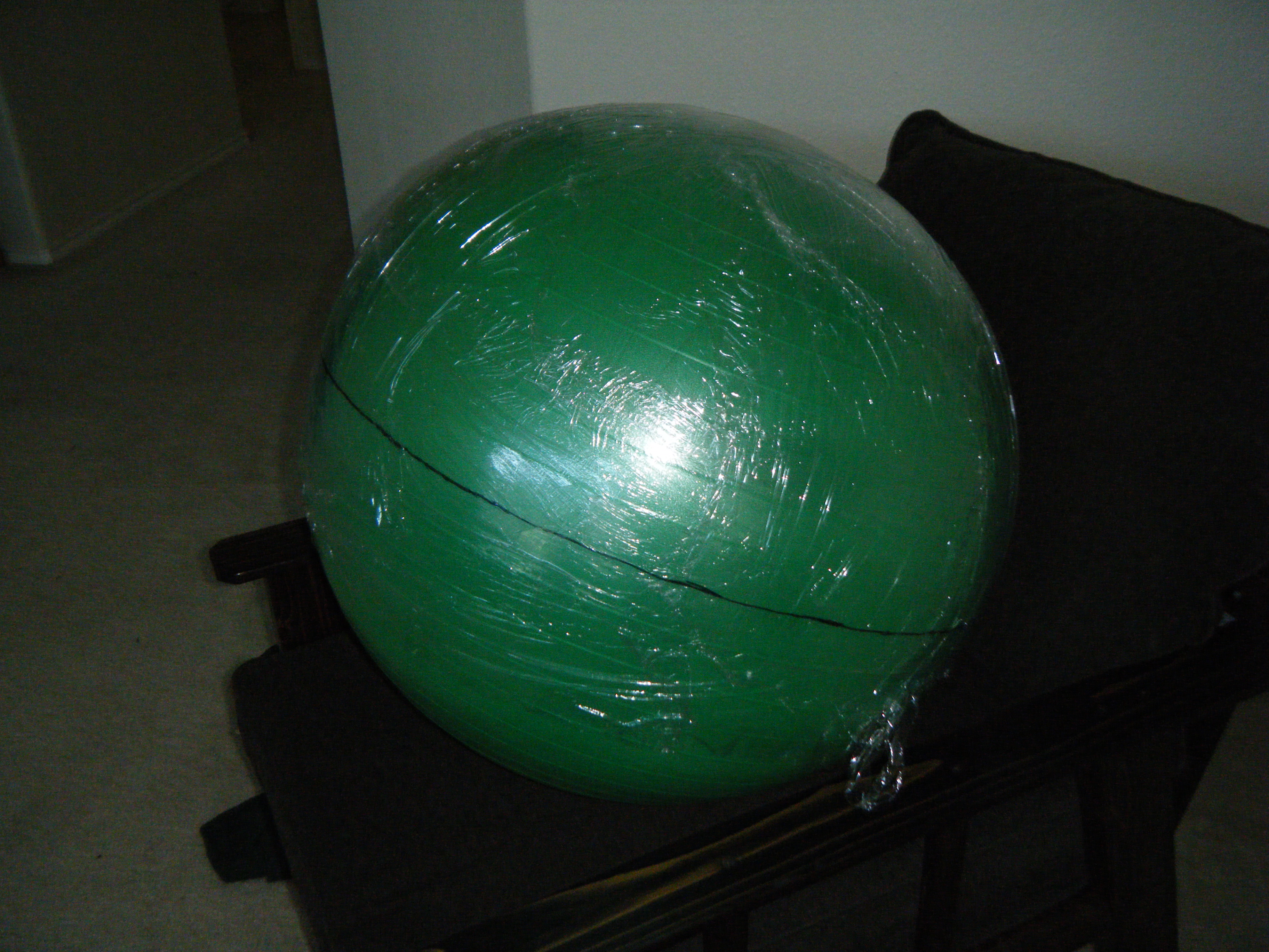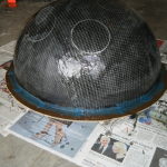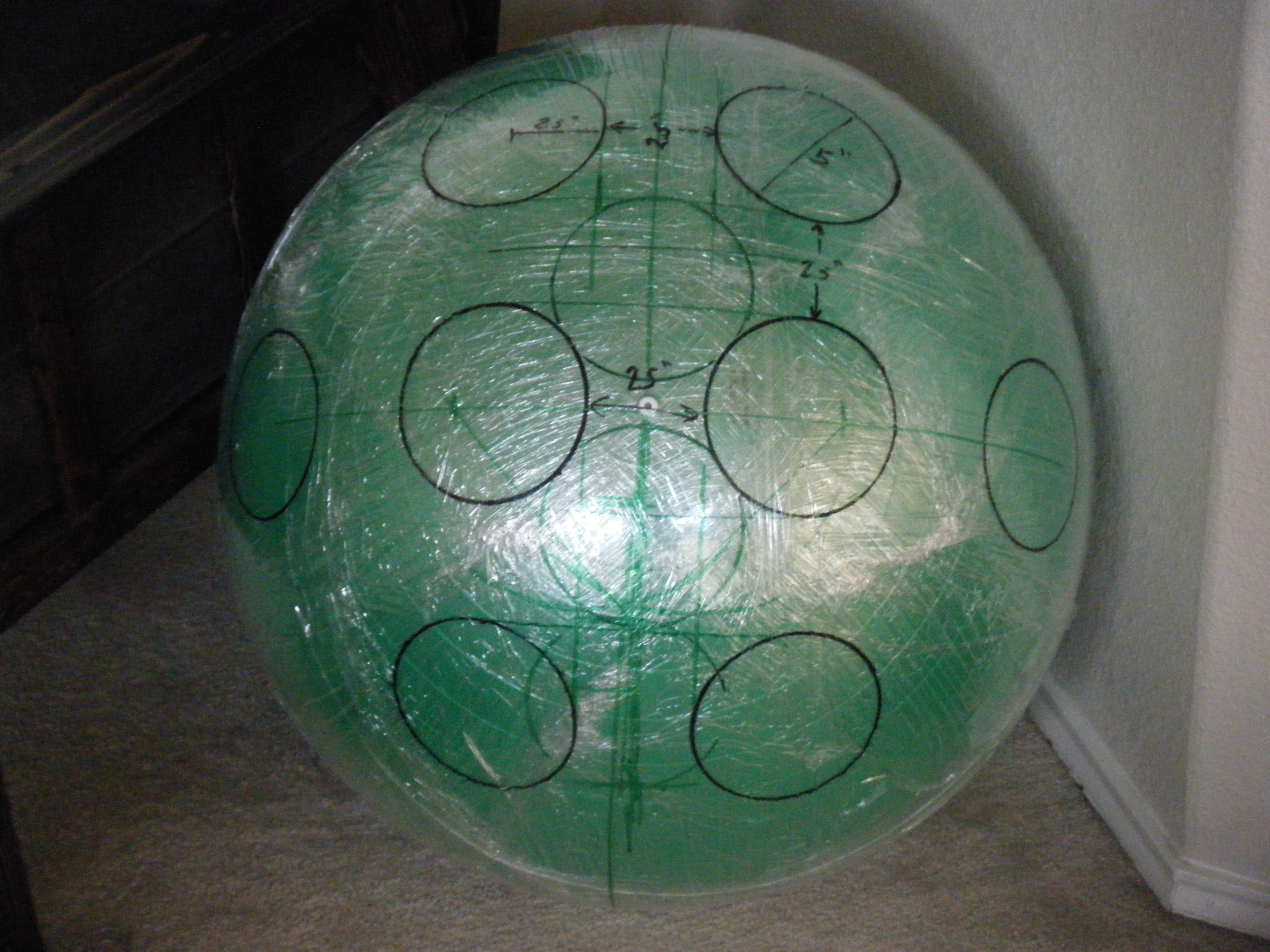 Since my sketch dictated a ~25″ diameter face dome, I bought a 26″ exercise ball, wrapped it in plastic-wrap to protect it (because I’m reselling it at work after I’m done using it as a mold), and did a layer of fiberglass and resin over top. I wasn’t sure if the solvents in polyester resin would eat through the plastic-wrap or not, so I played it safe and used epoxy marine resin. Once it cured, I deflated the exercise ball, trimmed the fiberglass piece down to a perfect hemisphere, and attached a lip of cardboard with some resin-soaked shop towels.
