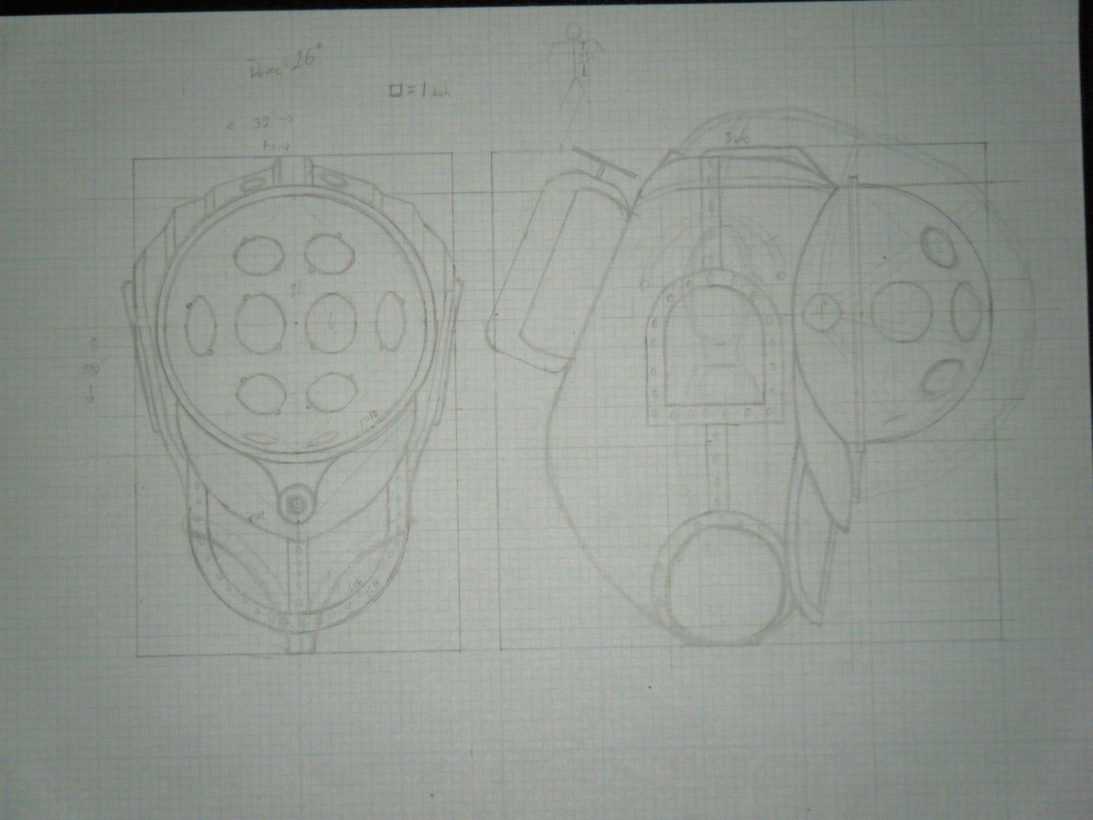 One of the hardest things to making this costume is the scale. Since I’d be entirely inside of it, all the pieces would only be scaled against each other, and I didn’t really have a good constant against which to gauge the size of all the other parts. With Pyramid Head, the size of the sword and helmet were pretty much decided by my own height and width, but with Big Daddy there was a lot of uncertainty in the mix. Some people play well with this freedom, but not me. I have a really hard time getting started when it’s not clear what the goal is, so I set out to sketch the character to scale.
