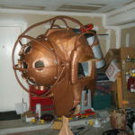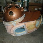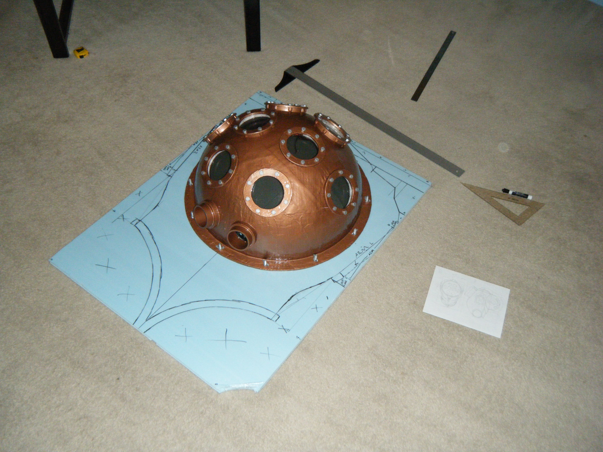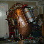 The port-holes were a colossal amount of work. I found some sewer pipe vent cover things in the PVC section at Lowe’s that have these little bumps where it looks a screw/bolt could go, so I bought 8 of those. I cut out the grille to make a hollow cylinder, added a small cardboard ring to the inside edge, resin’d the whole thing together to get a smooth single-piece appearance, and hit ’em with hammered brass spray paint. I traced these onto the 26″ fiberglass dome, cut out some holes, and glued ’em in place. I knew weight was going to be a problem, so instead of actually putting bolts in the port-holes, I took a silicone mold of some bolt heads and cast copies in resin. Hit those bolt-head copies with hammered steel spray paint, and hot-glued ’em onto the port-holes right above each nub. I then got a sheet of clear and a sheet of bronze transparent plexiglass and cut circles to fit into the port-holes. The clear pane went on the outside, and the transparent bronze on the inside, with a strip of yellow and a strip of red LEDs between the two panes. The idea was to have a light source just outside the bronze plexi to give a two-way mirror effect – I hate when you can see inside a costume. Last step was to trim off as much excess from those port-holes on the dome’s inside as possible, again to save on weight.