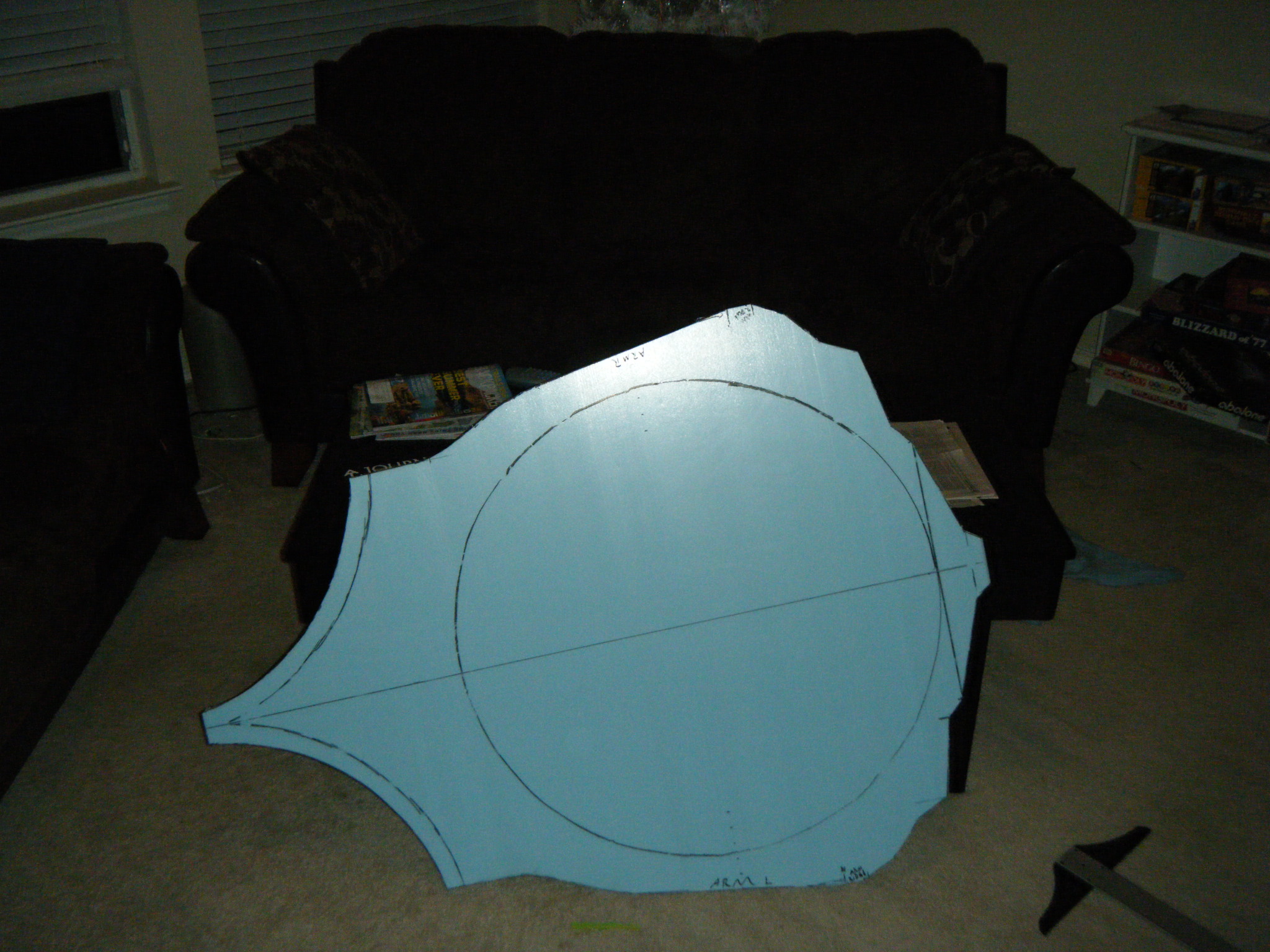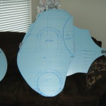I drew a front- & side-view of the character on graph paper at a scale of 1 grid space = 1 inch. Since a piece of the main shell would have to go between my legs, I knew the shell had to be at least as tall as I am from crotch to crest, plus a couple inches breathing room. That gave me a lower bound on size. As for upper bound, I knew I wanted my forearms to be the character’s upper arms, the distance between the elbow pits of my outstretched arms would be the upper bound on width (if anyone knows the proper term for this measurement, please let me know). As it turns out, when you take into account the correct ratios of a Big Daddy, these upper and lower bounds pretty much dictate the actual dimensions of the costume, give or take a couple inches. So with a pretty decent estimate on the costume’s height and width, I sketched a pattern that I’d follow for the next three months.