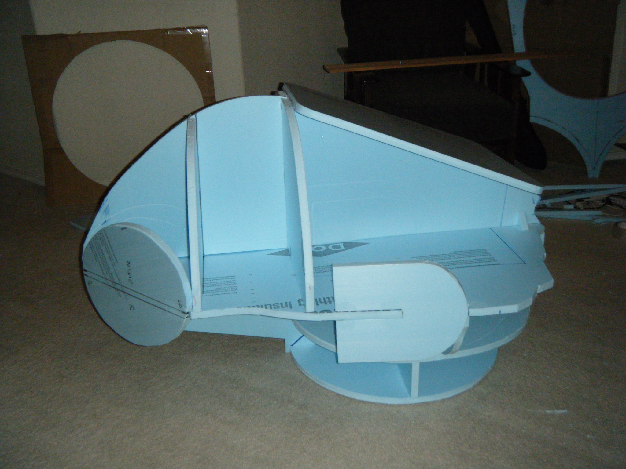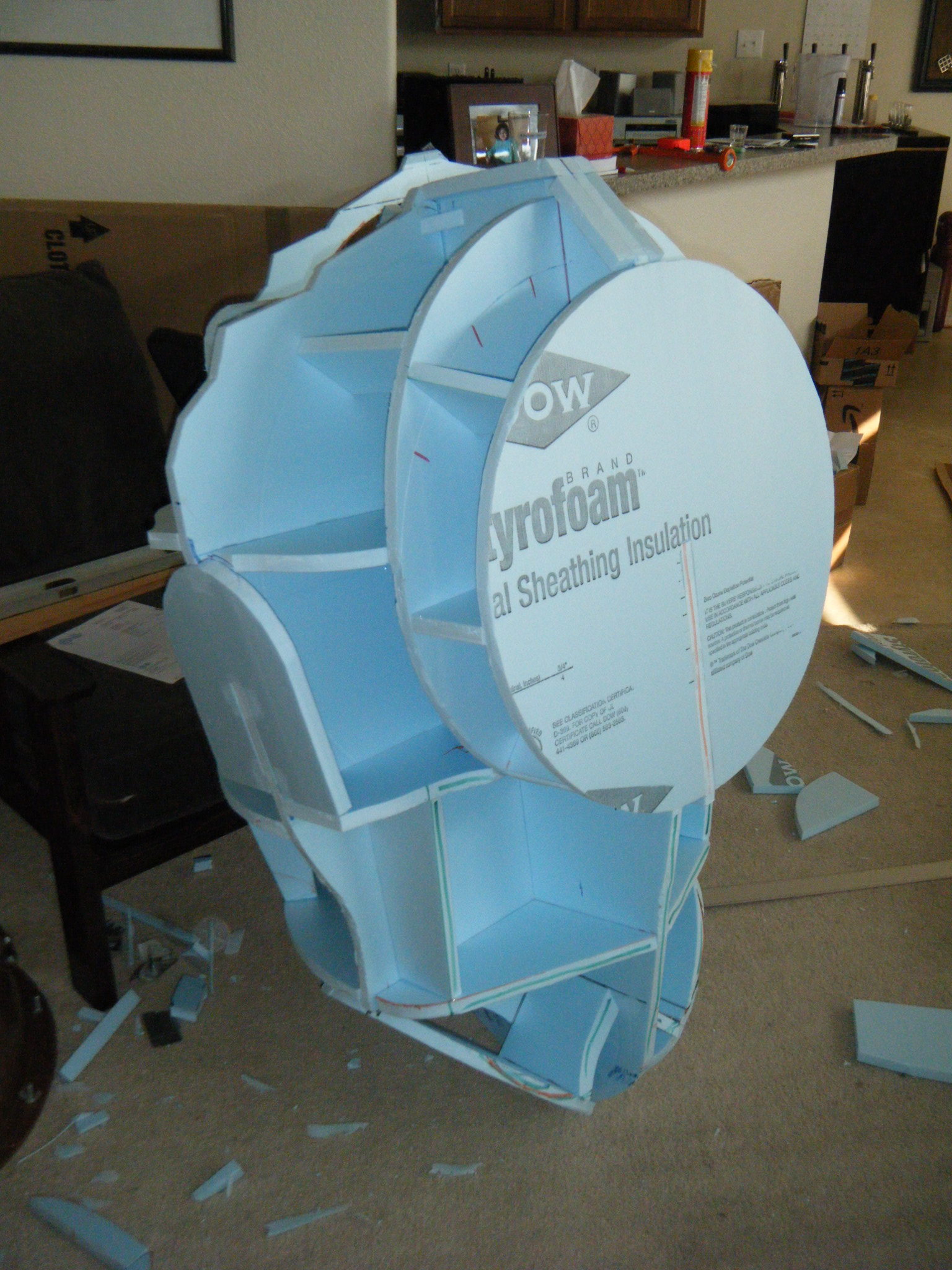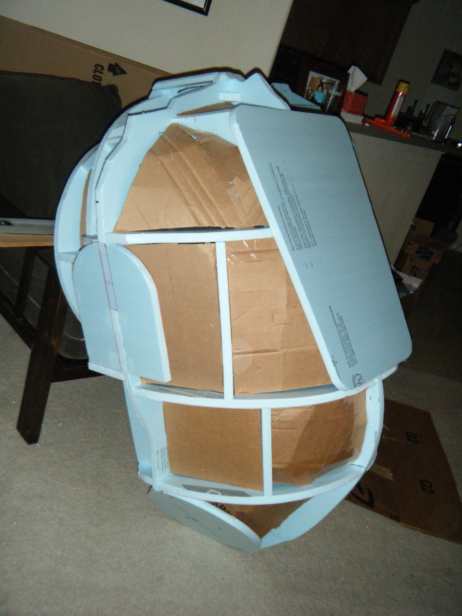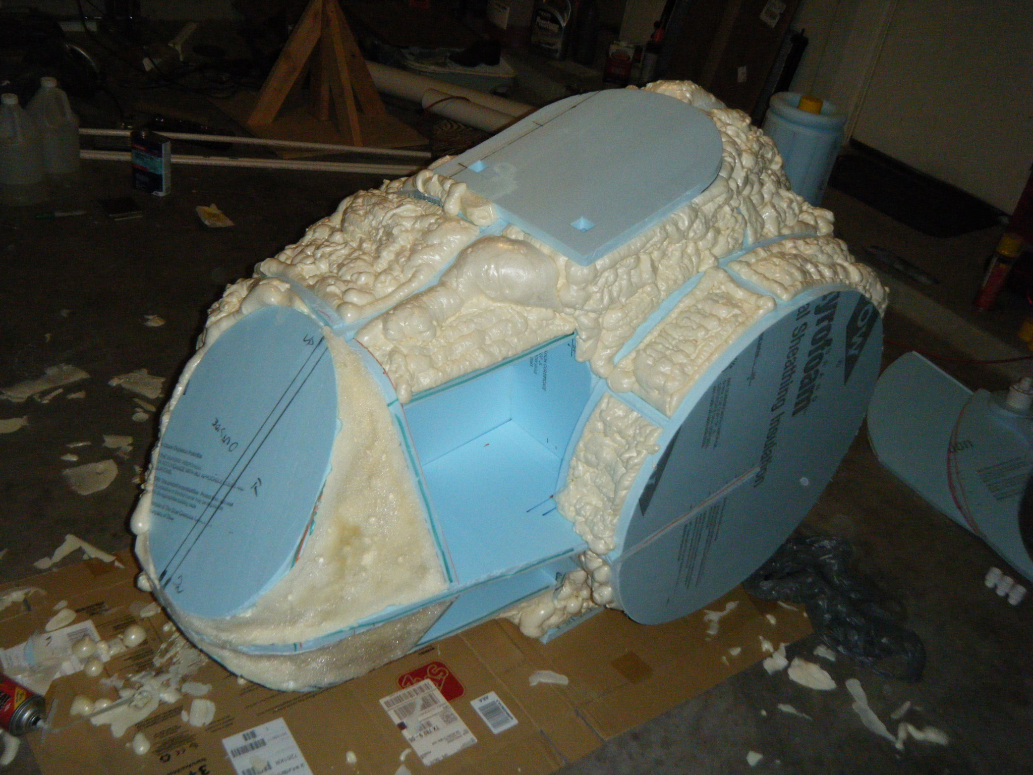 The big piece was the main body shell, and the chestplate that attaches to the front of it. I started this by cutting profile sections of 3/4″ foam board insulation, then cutting slots in each and fitting them together to give a really rough 3d representation of the body. I then cut pieces to represent the arm and leg holes, and also the big circle where the face dome would attach. I cut one more piece to indicate where the flat section on his back would be, where the tanks would attach. From there I just started referencing the sketch and adding skeleton pieces of foam throughout the body to give it some continuous form. Once a pretty decent foam skeleton was done, I taped cardboard in place and filled the space between the foam skeleton with Great Stuff spray foam. I love/hate that spray foam. Everything about it is wonderful, except that when you cut into it, it caves as the interior dries.