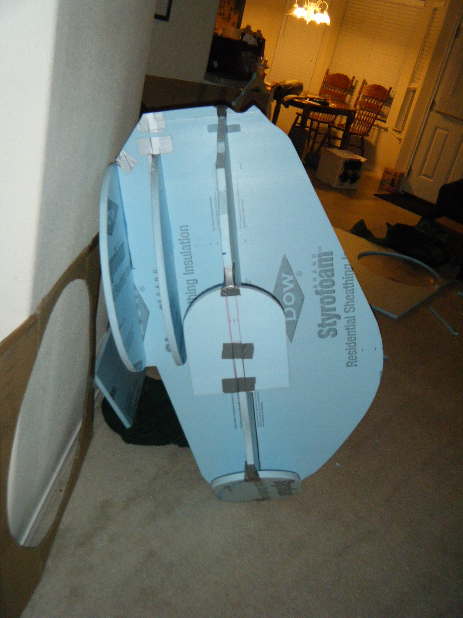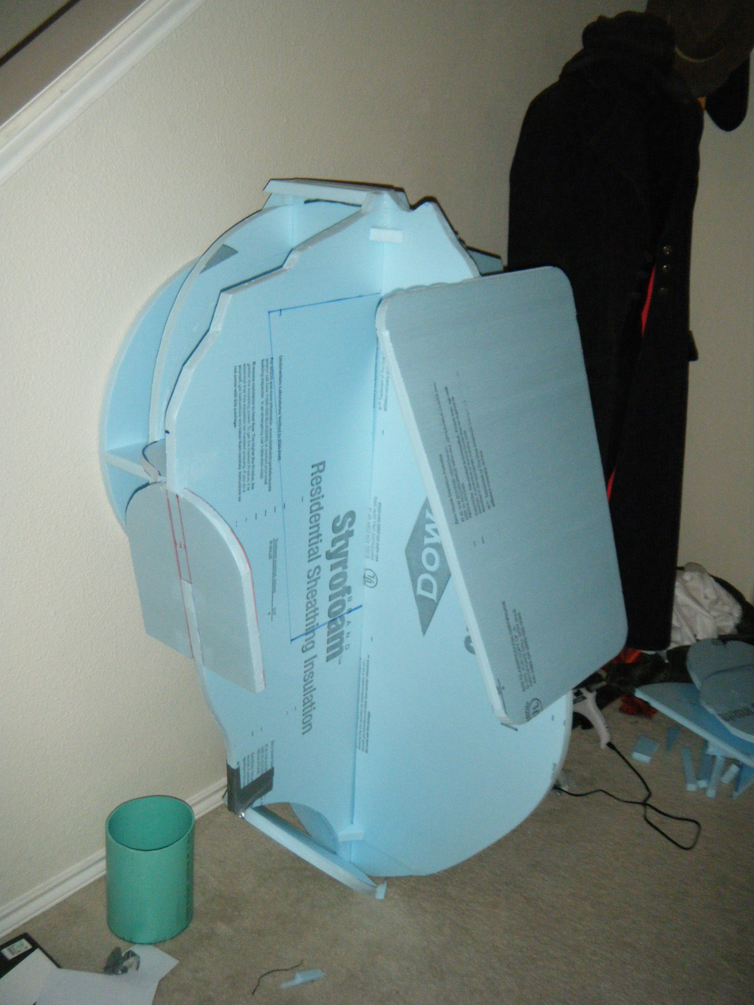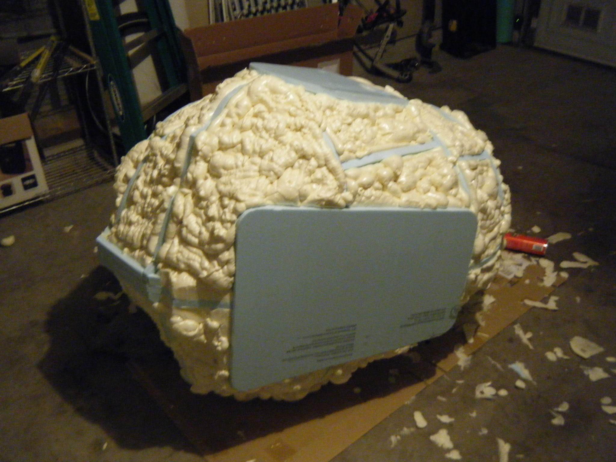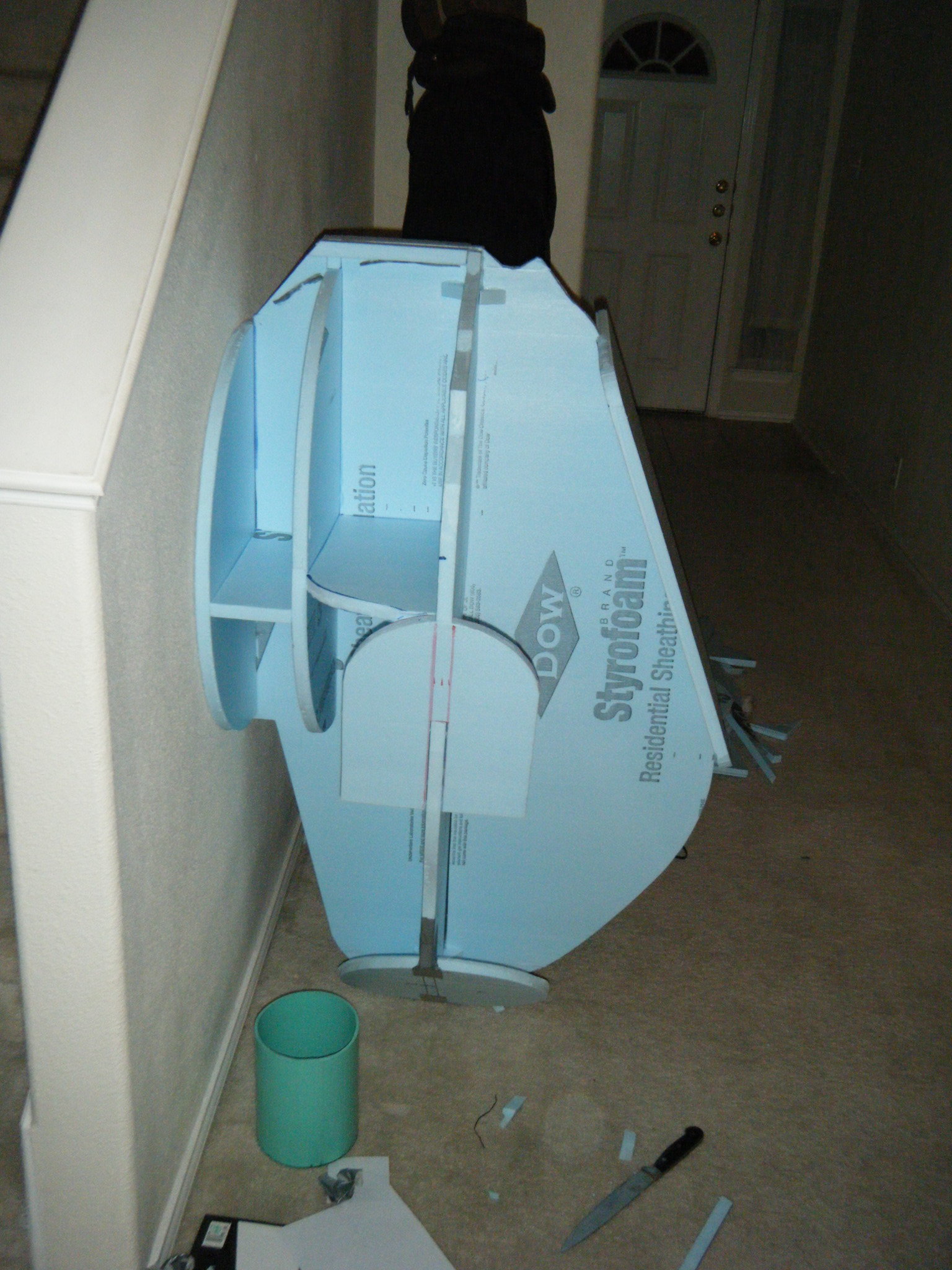 The big piece was the main body shell, and the chestplate that attaches to the front of it. I started this by cutting profile sections of 3/4″ foam board insulation, then cutting slots in each and fitting them together to give a really rough 3d representation of the body. I then cut pieces to represent the arm and leg holes, and also the big circle where the face dome would attach. I cut one more piece to indicate where the flat section on his back would be, where the tanks would attach. From there I just started referencing the sketch and adding skeleton pieces of foam throughout the body to give it some continuous form. Once a pretty decent foam skeleton was done, I taped cardboard in place and filled the space between the foam skeleton with Great Stuff spray foam. I love/hate that spray foam. Everything about it is wonderful, except that when you cut into it, it caves as the interior dries.