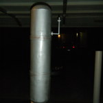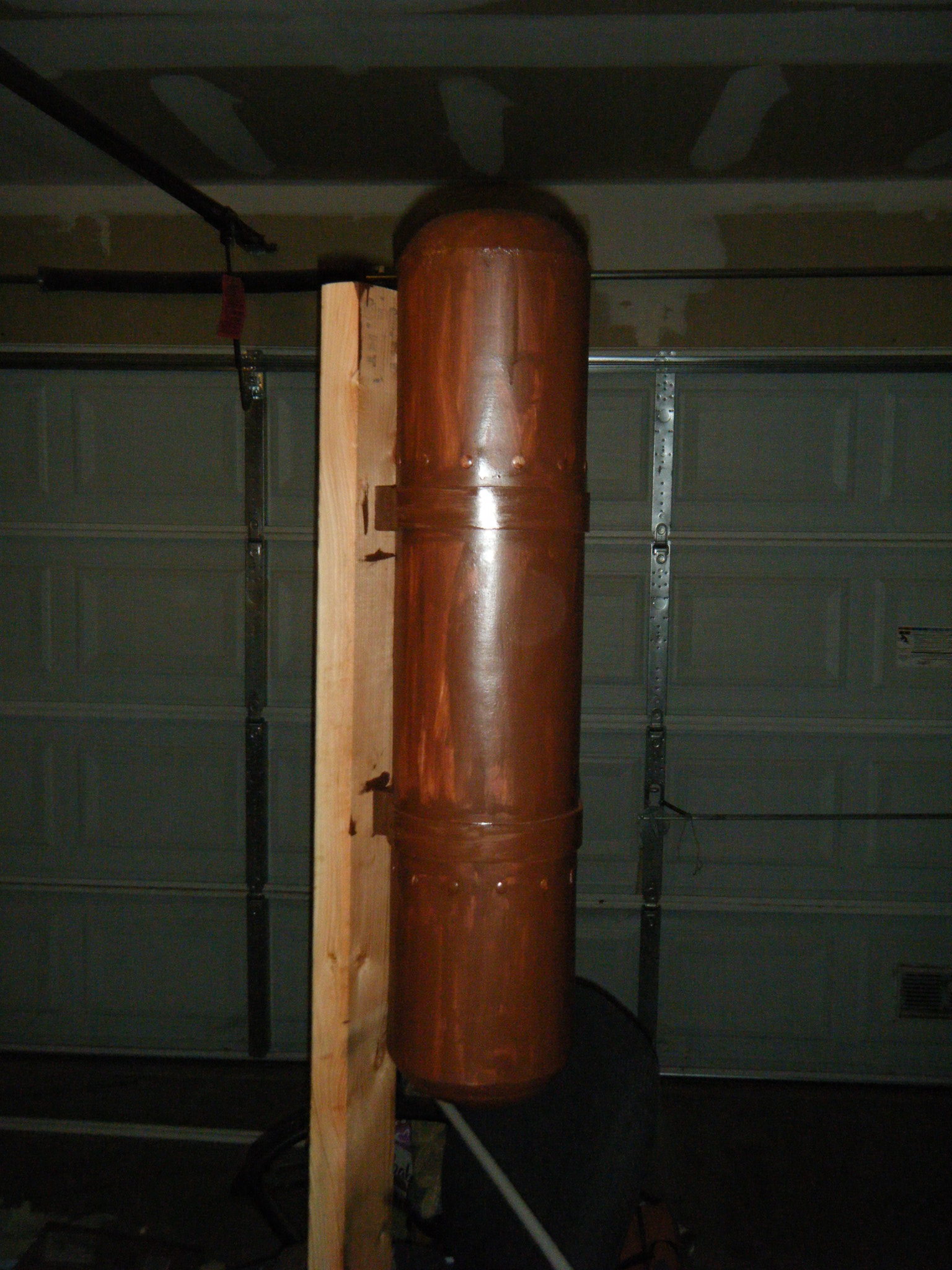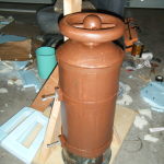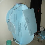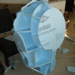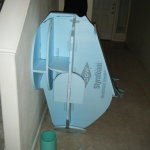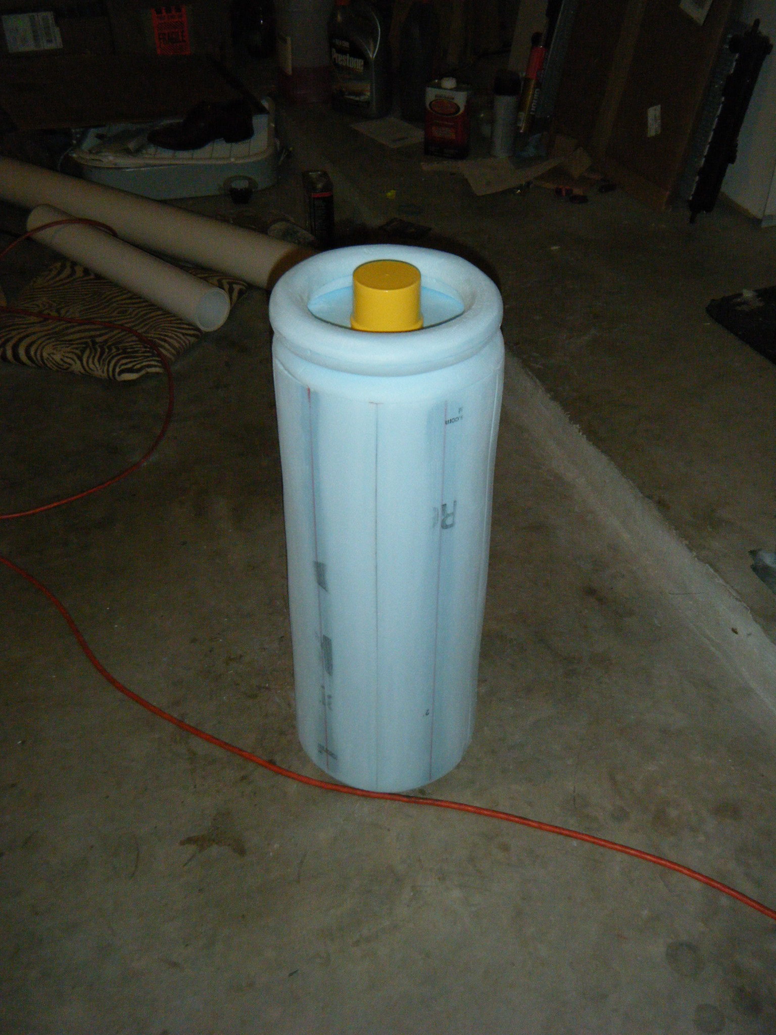 Once the port-holes were done, I picked a side to be the bottom and cut two more holes on that side for pipe vent things. I don’t know what they’re supposed to be on the character, but on my costume they were air intakes. I wrapped 3″ PVC pipes with some weatherstrip to make a little lip, then glued ’em in place and zip-tied some 80mm computer case fans on the inside. I planned on building the costume out of foam insulation, so every bit of ventilation I could manage would be tremendously welcome.