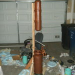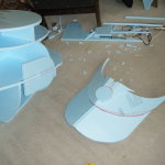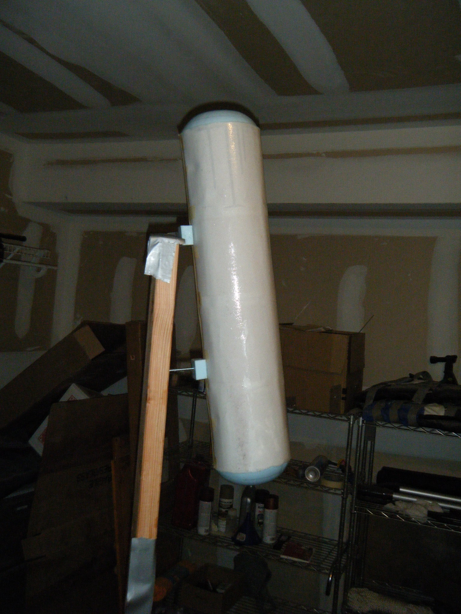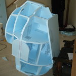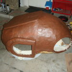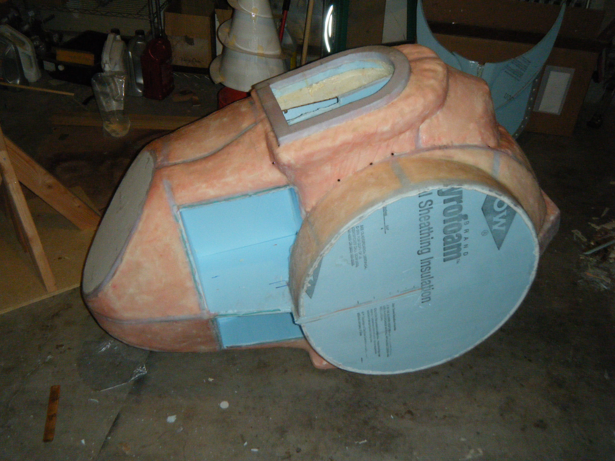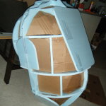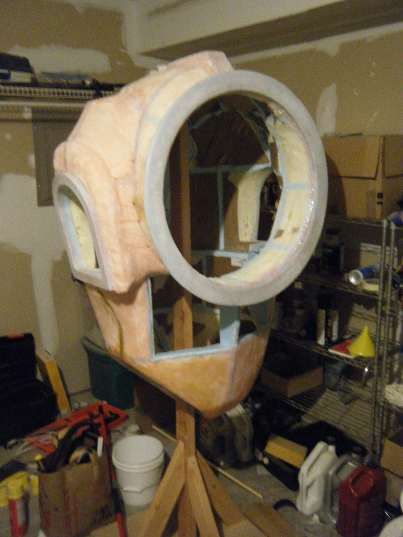 Hard exterior done, it was time to hollow everything out. Once hollowed, I cut a ring of 1/2″ foam board for the lip against which the face dome would rest, and added a bit more resin and fabric to hold it in place. I reinforced this area a bit extra since I knew it would be supporting the full weight of the face dome. Once I had it sufficiently reinforced, I cut holes in the side for a 3″ PVC pipe and stuck 3x 1/2″ PVC connectors on each of the 3″ pipes. These would eventually hold the roll cage.