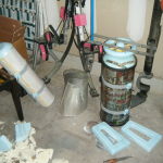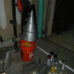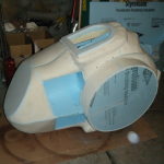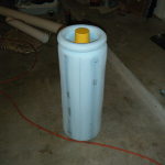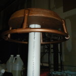 The roll cage around the main body shell, in front of the face dome, and also around the drill auger was made from 1/2″ PVC. To bend it, I would find something that already has the arc radius I want (a bucket, for example), or I would cut my own arc from foam board. I’d then cut a piece of PVC to the size I wanted (+ a couple inches), cap one end with masking tape, fill it with sand, cap the other end with masking tape, and bake in my oven at 250F until floppy. The sand filling kept the pipe from collapsing, and also helped it retain heat a bit longer. To form the pipe I’d just pull it out of the oven (with mittens) and hold it around the arc I’d prepared until it cooled (~2 minutes).