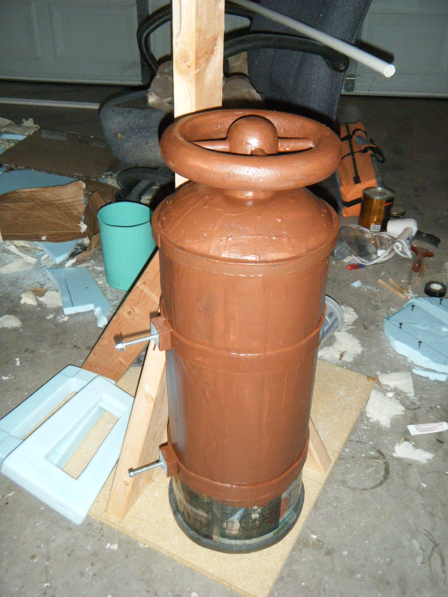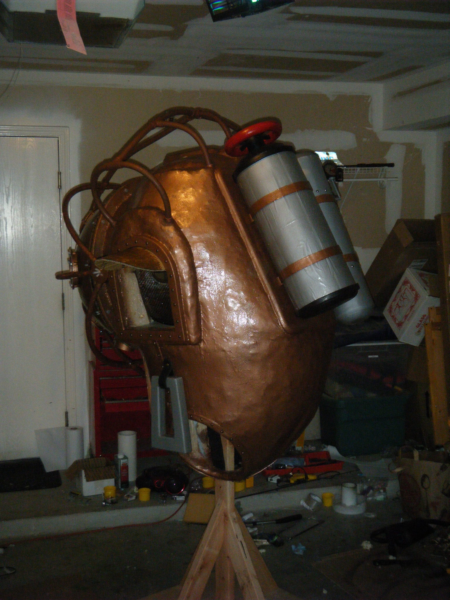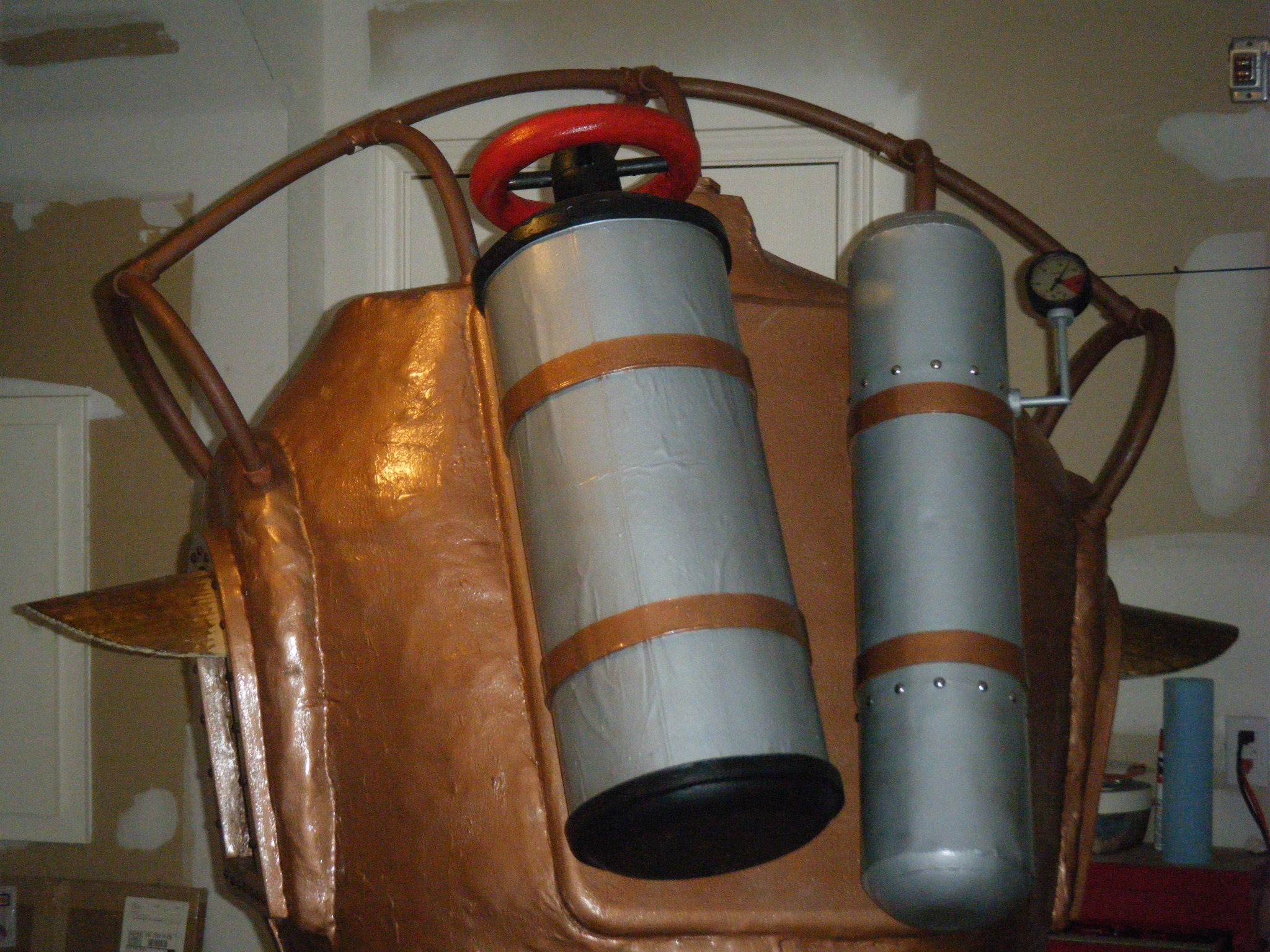 After painting and assembling the face dome, main body shell, and chest plate, this costume was looking pretty good. It felt like I was almost done, but I knew I was a long way from it. It’s ridiculous how many peripheral pieces are part of this thing. I built two oxygen tank sort of things out of foam board and posterboard. One got a wheel valve on top and the other got a pressure gauge coming out the side. The pressure gauge is one of my favourite parts. I built a couple bolts into each tank permanently, and drilled holes through the main body shell to anchor those tanks onto the back. They’re held on with a couple wing nuts from the inside.