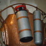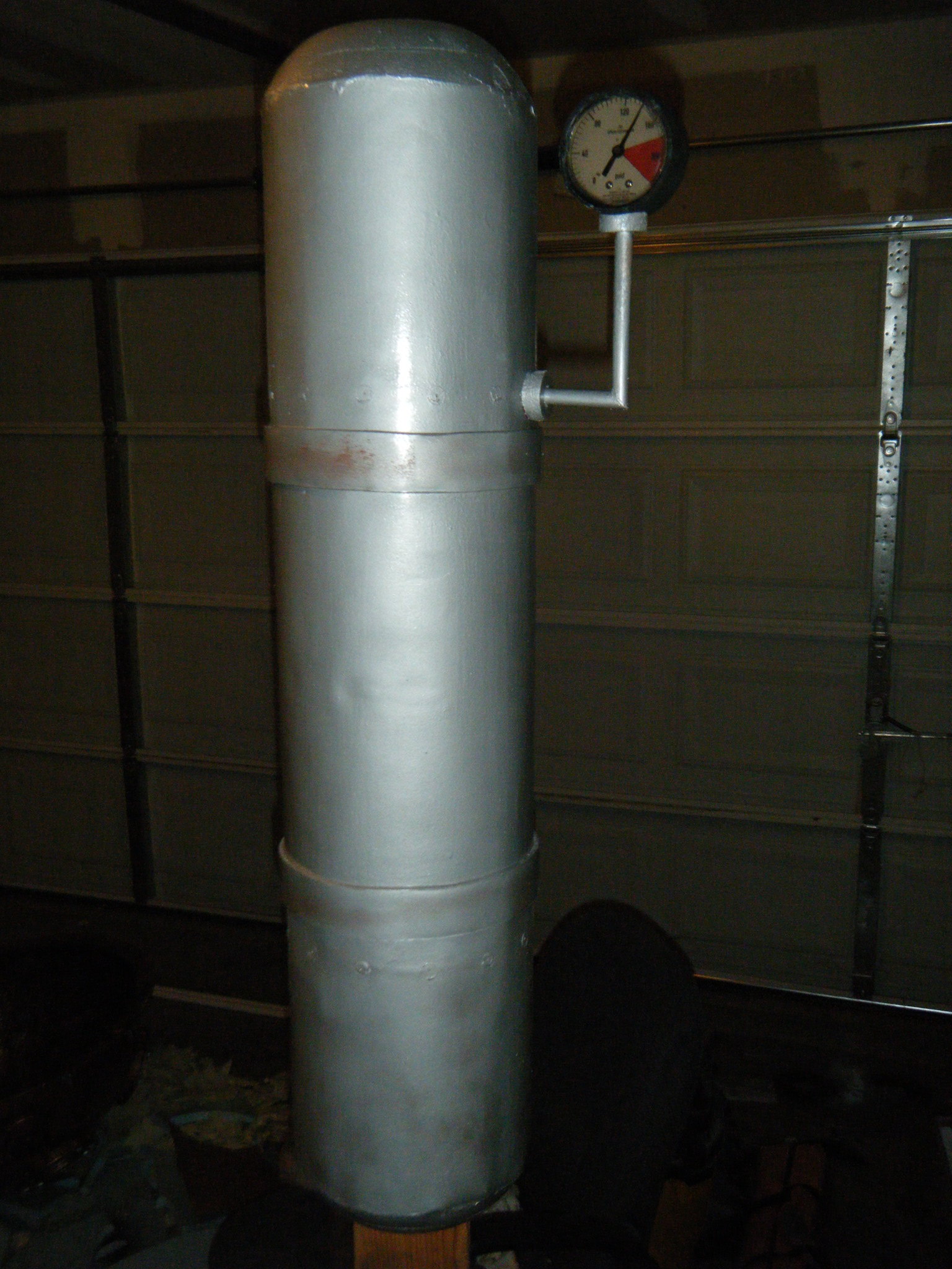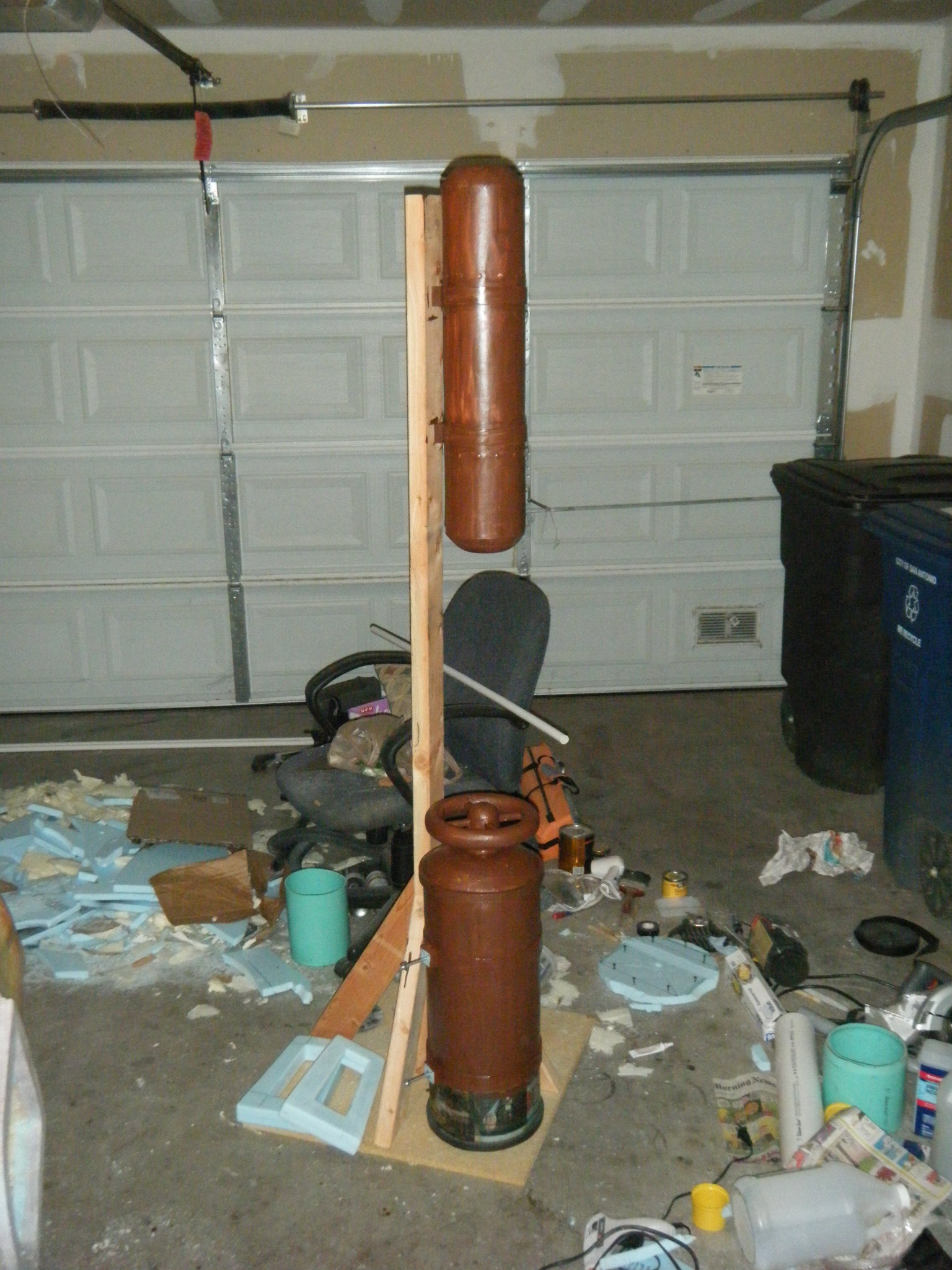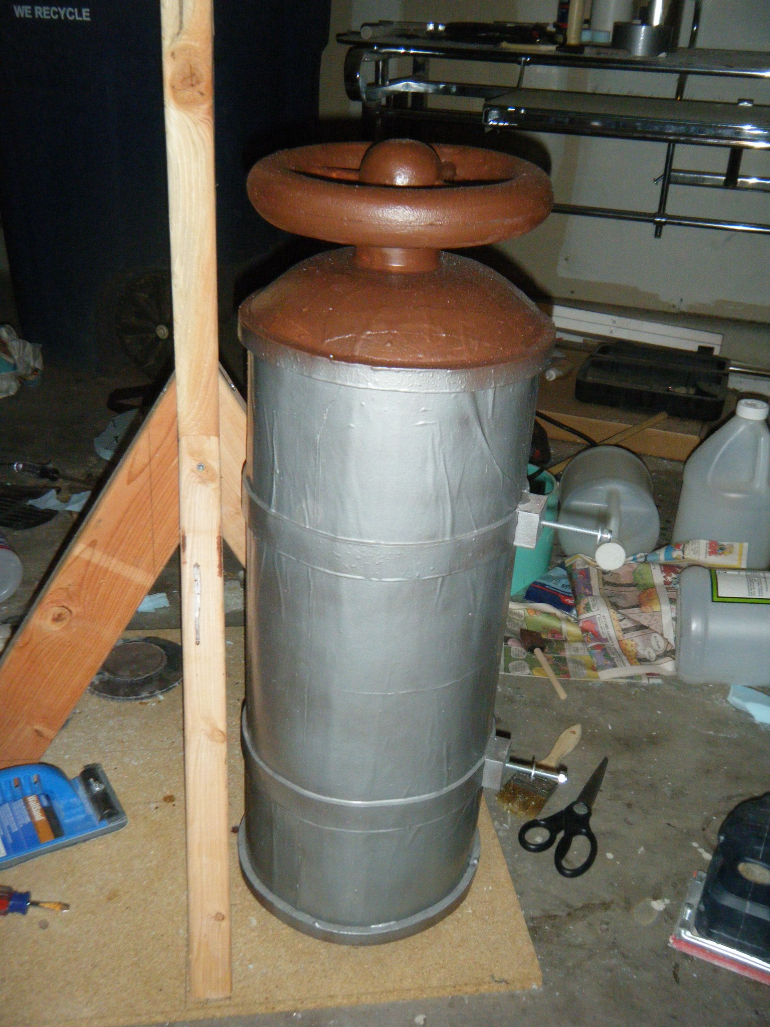 After painting and assembling the face dome, main body shell, and chest plate, this costume was looking pretty good. It felt like I was almost done, but I knew I was a long way from it. It’s ridiculous how many peripheral pieces are part of this thing. I built two oxygen tank sort of things out of foam board and posterboard. One got a wheel valve on top and the other got a pressure gauge coming out the side. The pressure gauge is one of my favourite parts. I built a couple bolts into each tank permanently, and drilled holes through the main body shell to anchor those tanks onto the back. They’re held on with a couple wing nuts from the inside.