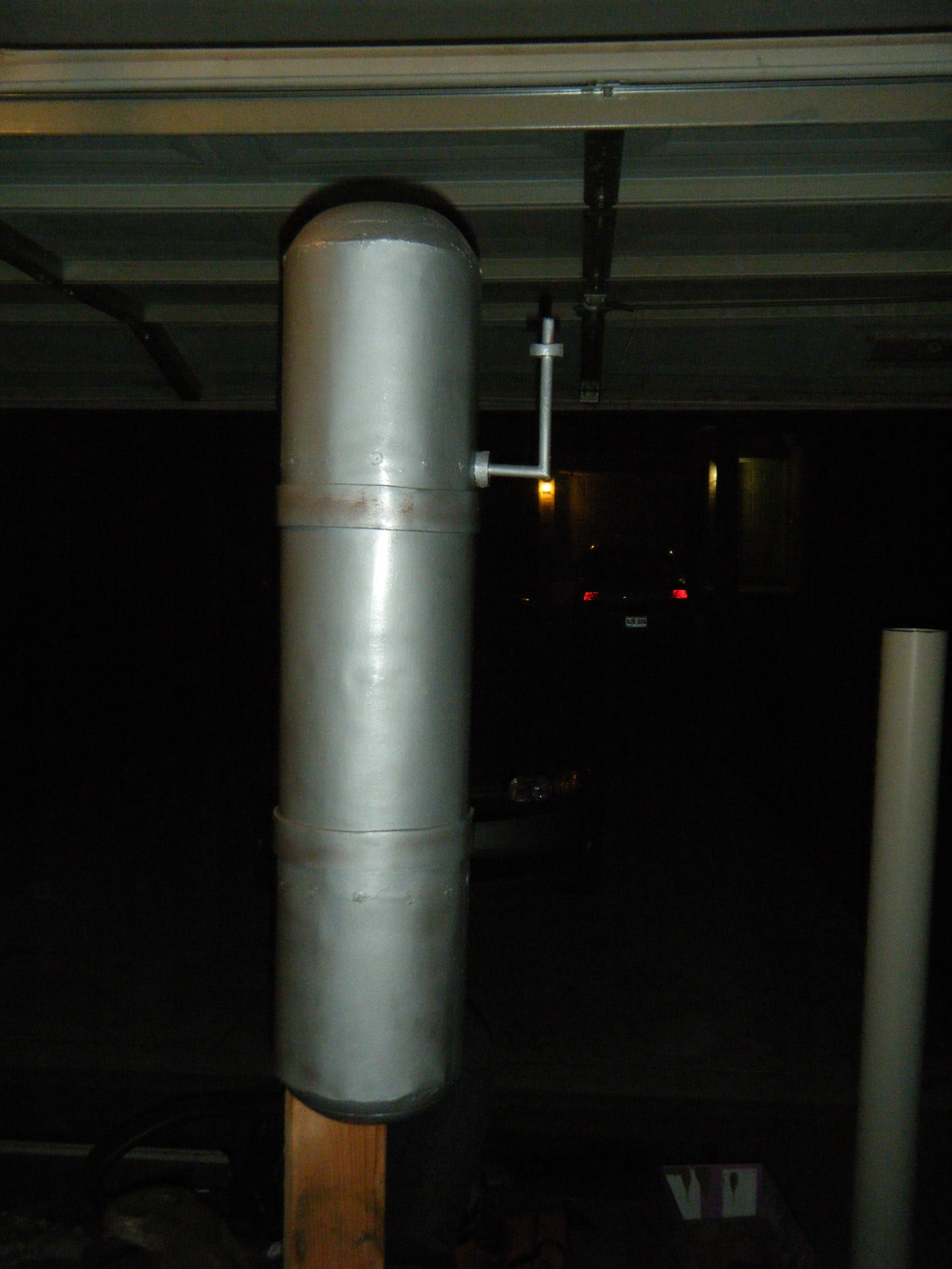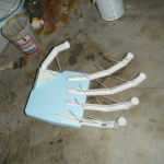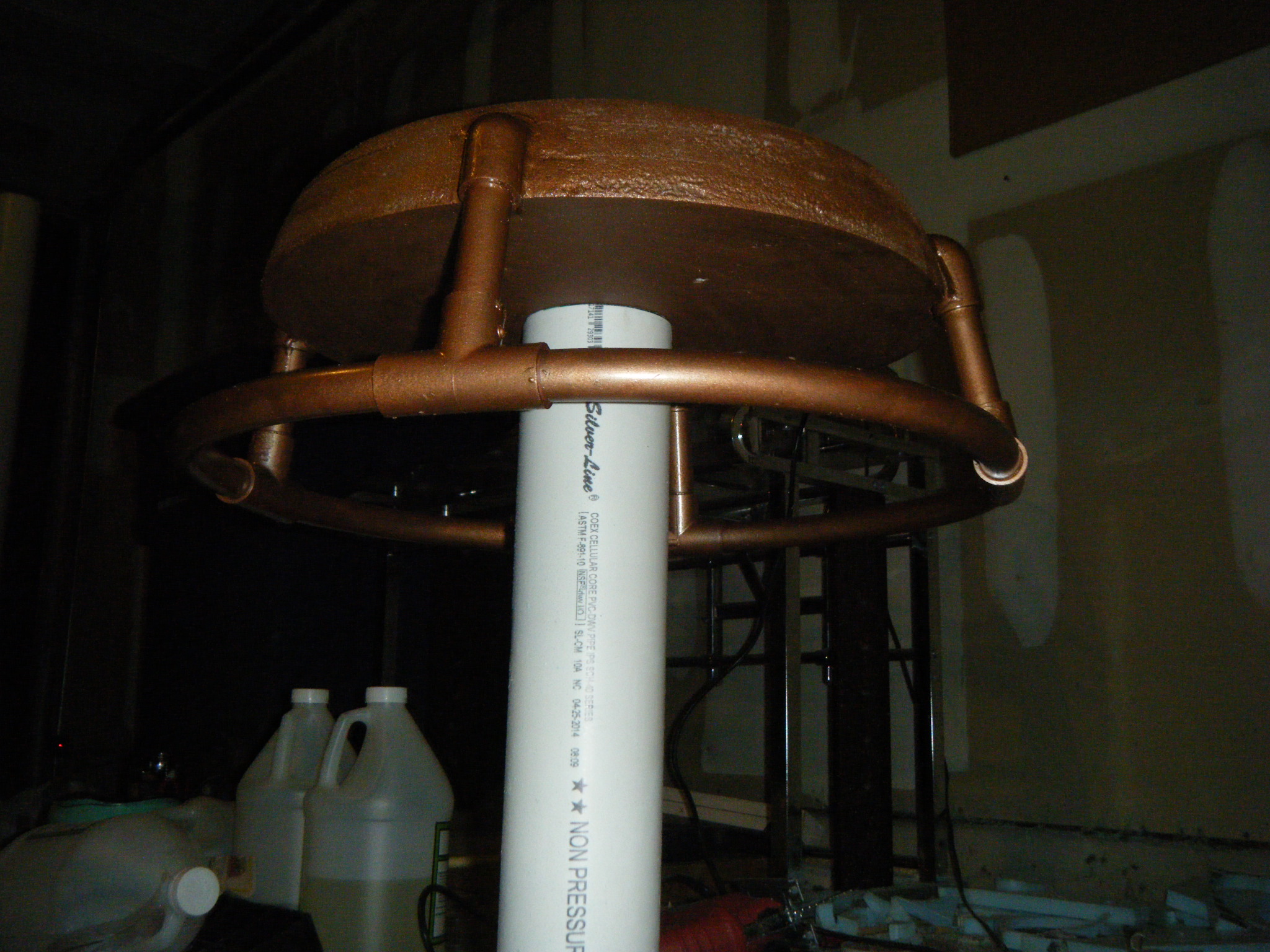 Each of the arms was a feat of modern engineering. The main shell was about as wide as my outstretched arms from elbow-to-elbow, so I had to build fake arms, with my elbows where Big Daddy’s shoulders would be, and my wrists at his elbows. This meant his forearm was all a PVC-core extension, and his hand/drill was anchored to the end of that extension. For both arms I used 4″ PVC for his bicep and forearm portion, and connected them with a hinge built from some hardware I found at Lowe’s. It was angle brackets, or angle reinforcements, or something.