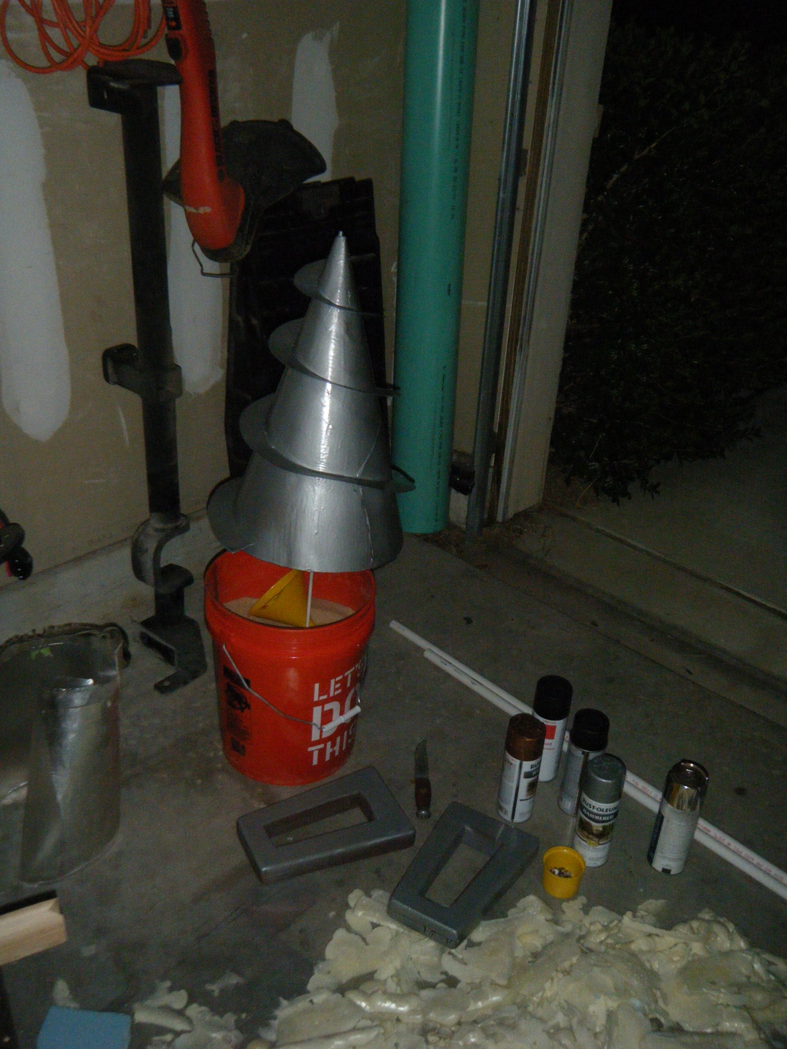 BD’s right arm was significantly more complex. That drill was a tricky piece. I decided to build the auger cone from a skeleton of foam board, and I ran a fiberglass rod down the middle of it. I planned to clamp a power drill onto this rod to spin the auger. The rod had to be glued very firmly in place, or it would break free from the foam. With the main structure of the auger done, I wrapped it in posterboard. The rifling is more posterboard, masking-taped to the cone. The whole thing got a few layers of resin and some hammered steel spray paint. To hold the cone firmly against the PVC forearm but also allow it to spin freely, I got a 6″ lazy susan bearing and mounted one end to the cone. The other end was firmly secured to a foam & PVC base that was itself glued solidly to the PVC forearm. Inside the PVC forearm, I mounted a foam board disc with a cutout to fit the top part of a power drill. The power drill’s chuck clamped onto the fiberglass rod, and a rocker switch in the forearm next to my right hand controlled the power to the drill. I really wish I had photos of this part, because it’s tough to convey in text alone.